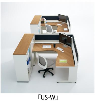 「US-W」は、ウッドテイストのあたたかな印象を与える木製天板シリーズです。一般的なストレート型のほか、L型、120°型、半円型などさまざまな形状をラインアップ。コミュニケーションを重視したグループワークから集中して行うクリエイティブワークまで多彩なレイアウトを実現します。