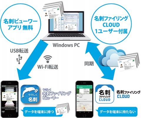 「スマートフォン用名刺管理ビューワーアプリ(無料)」と連携して、PCからスマートフォンへUSBもしくはWi-Fiを経由してデータを転送することができます。