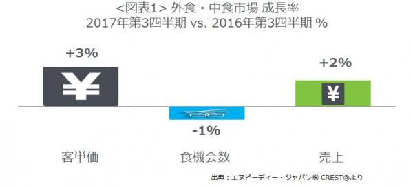 外食・中食市場全体の2017年第3四半期の成長率(図表1)をみると、売上(市場規模)は、5兆2357億円で対前年同期比2%増、4期連続のプラス成長となりました。この市場規模の成長は、客単価上昇(+3%)によるものです。客数(食機会数*2)は1%減で、2016年第2四半期以来5四半期ぶりのマイナスとなりました。
