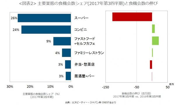 業態別の食機会数の成長率(図表2)をみてみると、全体の26%を占めるシェア1位のスーパーマーケットが前年同期比でマイナス1.3億食機会(5.1%減)と大きく減少しました。スーパーのマイナス成長は3期連続です。今期は外食・中食市場の食機会数減少の95%を占め、市場全体の客数(=食機会数)2%減少の要因はほぼスーパーの減少によるものだったことが分かります。