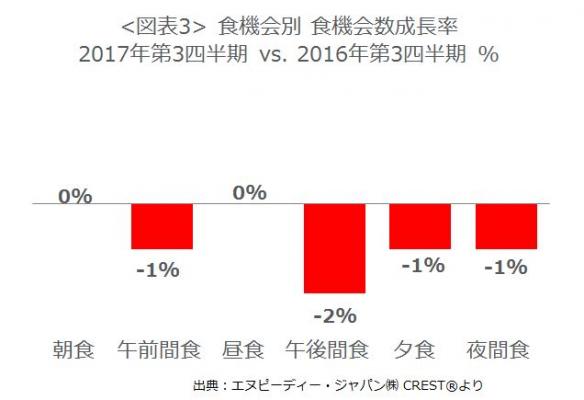 食機会別の成長率(図表3)をみると、プラス成長した食機会はなく、朝食と昼食は横ばい、夕食と午前間食、午後間食、夜間食はそれぞれマイナス成長となりました。