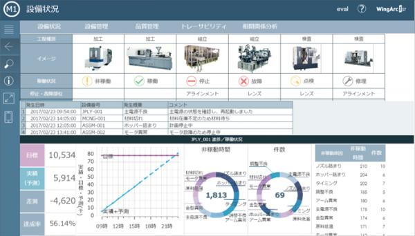 ウイングアークは、設備からのIoTデータや人が入力したデータなど、生産ラインにおける様々なデータを収集・蓄積し、「MotionBoard」で工場内の設備毎の稼働率・稼働状況や、生産状況の把握など、リアルタイムで“生産現場の可視化”を実現する「MESソリューション」を提供しています。