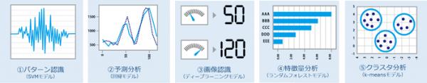 具体的には、パターン認識(SVMモデル)、予測分析(回帰モデル)、画像認識(ディープラーニングモデル)、特徴量分析(ランダムフォレストモデル)、クラスタ分析(k-meansモデル)というIoTデータ分析に適した解析モジュールを組み合わせることによって、人では気づかない故障の予兆の検知、熟練技術者の知見・意思決定プロセスのデータ化、異常検知時のアラート、異常の原因となる油切れやすべり軸受の傷といった具体的な内容の検知など、人間にはできなかったことができるようになります。