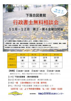 東京都行政書士会(東京都目黒区/会長:常住 豊)と同新宿支部(支部長:河野 正樹)は新宿区立下落合図書館(新宿区下落合1-9-8)にて開催される「行政書士無料相談会」に協力し相談員を派遣します。市民生活に身近な図書館と市民相談に力を入れる行政書士会との連携によるこの相談会では、相続、遺言、贈与やクーリングオフ、内容証明、許認可など行政書士が解決できる範囲すべてを受け付けます。