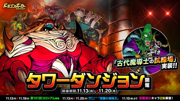 11月13日(月)メンテナンス後より、全100層の高難易度ダンジョン「タワーダンジョン」を開催いたします。また、150レベル以上から参加可能なタワーダンジョンの追加コンテンツ「古代魔導士の試練場」も同時開催いたします。クリアするとさまざまな報酬がもらえますので、ぜひチャレンジして、報酬を手にいれましょう!