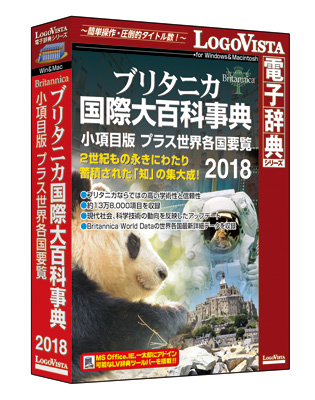 ロゴヴィスタ株式会社は、パソコン用電子辞典において絶対なる信頼と実績を誇るベストセラー「LogoVista電子辞典シリーズ」の新作として、ブリタニカ・ジャパン株式会社との連携により、『ブリタニカ国際大百科事典 小項目版 プラス世界各国要覧 2018』(DVD-ROM版)を、2017年12月8日(金)よりパソコンショップ、カメラ系量販店、大手書店、ダウンロード販売サイトなどで発売いたします。