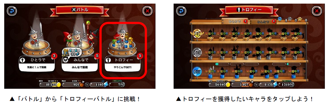 各キャラのトロフィーは、「トロP」を一定数貯めると獲得することができます。トロPは「キャラのLvが20以上」「うまP200以上」など、各キャラによって異なる条件を満たした状態でバトルを行なうと獲得できます。また、バトルを開始すると「ボーナスバトル」が発生することがあり、バトルの勝敗に関係なく、獲得トロPが2・3・5・10倍のうちいずれかの倍率で増加します。ボーナスバトルが発生したら、勝利してトロPの大量獲得を目指しましょう!