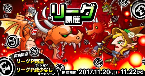 11月20日(月) より、全国のユーザーたちを相手にリアルタイムで戦い、ランキングを競いあう「リーグ」が開催!ひとりで挑戦できるのはもちろん、友達と一緒にタッグ・トリオ戦にも挑むことができます。バトルに勝利して、ランキング上位や報酬のドラゴンメダル大量獲得を目指しましょう! また、今回は勝敗結果によるリーグPの減少がなくなる「リーグP減少無しキャンペーン」を同時開催いたします。リーグPを集めて、ランキング上位を目指しましょう!