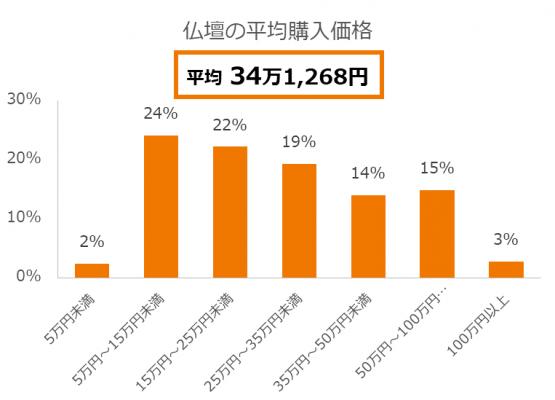 仏壇の平均購入価格は全国で34万円。一番のボリュームゾーンは「5万円~15万円未満」で24%と、上置き型の小さめの仏壇を購入される方が多いことが伺えます。一方、最大300万円で購入される方もいるなど、高級仏壇へのニーズも一定数存在することが伺える結果となりました。住環境の変化に伴って仏壇の小型化が主流になる中、仏壇業界では小型でも商品のデザイン性、品質を高める創意工夫、家具メーカーと仏壇を共同開発するなど、仏壇をもっと身近なものにしてもらうための創意工夫や単価を維持するための努力を行っていることがみられています。