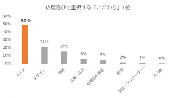 仏壇購入者が、仏壇を選ぶ際に最重要視するポイントが「サイズ」という方が50%に及ぶことが分かりました。仏壇探しで重視したこだわりポイントを3つあげてもらったところ、「サイズ」「デザイン」「価格」の3つが80%以上と圧倒的な結果となりました。その次には「仏壇店の接客」が21%となりました。
