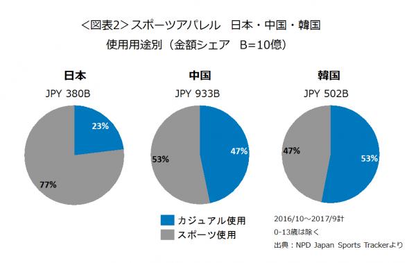 最新の直近1年(2016年10月~2017年9月 0-13歳除く 金額ベース)データによると、日本・中国・韓国のスポーツ使用と、スポーツ以外のカジュアル使用の比率をみると、カジュアル使用は日本では23%ですが、中国では日本の2倍で47%、韓国ではスポーツ使用を上回る53%です(図表2)。