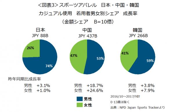 アスレジャーの着用者男女比を見ると、日本では女性26%、中国では47%、韓国では41%と、他国と比べ日本では女性の比率が低くなっています(図表3)