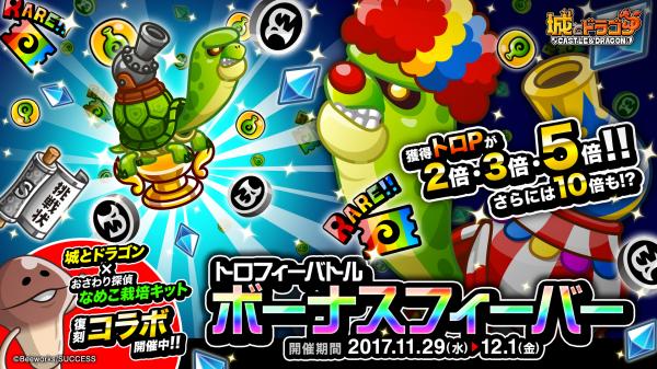 2017年11月29日(水)より、各キャラのトロフィー獲得を目指して全国のプレイヤーとバトルを行なう「トロフィーバトル」と、獲得トロPが通常より増量する「ボーナスフィーバー」を開催いたします。また、「シルバー」クラス以下限定のリーグも同時開催いたします。