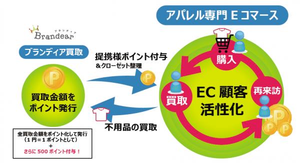 フリマサービス等CtoCの流行により顧客のリユース意識は一段と高くなり、下取りサービスは今後も顧客の購入動機にインパクトを与える大きなエンジンとなっていくと考えています。この取り組みを強化していくため、2016年12月より、ブランディアは買取金額を各社が運営するポイントで受け取れる仕組みや、自社販路購入商品の下取りサービスを開始するなど、提携先様の経済圏を循環させるシステムを本格導入しました。このシステムを各提携先様に展開することにより、サービスのユーザー数拡大、サイトへのリピート率の向上等、販促につなげる支援を行っていきます。