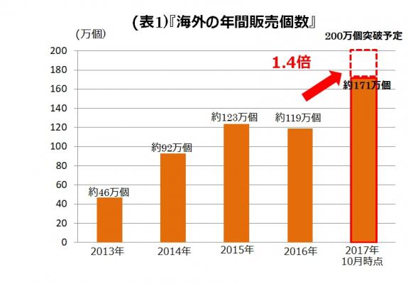 2017年10月時点で、累計販売個数1,600万個突破した「ベビーフット」。主な要因は2017年の海外販売個数の増加です。2017年1月~10月の販売個数は171万個越えし、昨年の年間販売個数と比較すると1.4倍増加 (表1)。海外の累計販売個数が約682万個(※4)の中、2017年の年間総売上個数は200万個突破予定です。特に販売個数を伸ばしたのはアメリカ。今年からアメリカの某大型スーパーで一気に拡販したことから販売個数が急伸長しました。