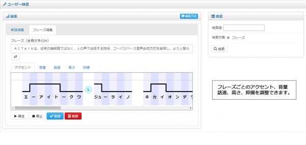 従来の単語登録機能に加え、文章をフレーズ単位でアクセント調整し、登録することができます。また、音量・話速・高さ・抑揚もアクセント句単位での調整が可能になり、より自在な音声チューニングが可能になりました。