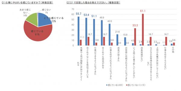一方仕事のやりがいを感じていないグループの理由としては、「成長実感がない(61.1%)」「いつも同じ仕事で新しいことがない(33.3%)」など成長実感を感じていなかったり、仕事への物足りなさがあがりました。