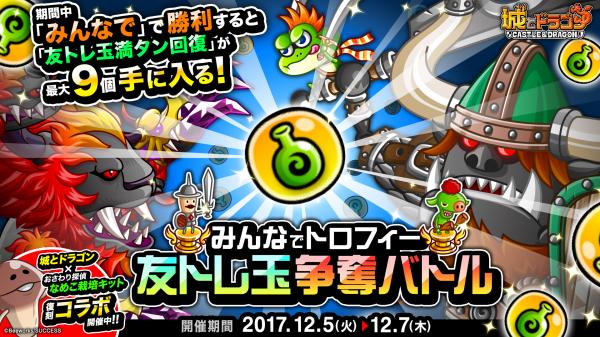 12月5日(火)より、みんなでトロフィーバトルに勝利すると、友トレ玉満タン回復が1個もらえる「みんなでトロフィー友トレ玉争奪バトル」が開催されます。みんなで協力して、友トレ玉を手に入れましょう! また、「シルバー」クラス以下限定のリーグも同時開催いたします。