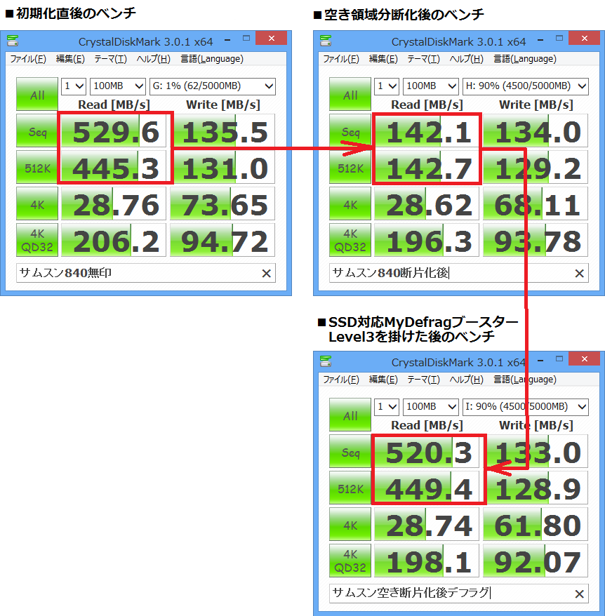 これとは別にNTFSファイルフォーマットである限り、デフラグをしないと速度が遅くなります。