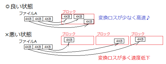 このブロックによりファイルに断片化が発生してブロックをまたぐと速度が低下します。