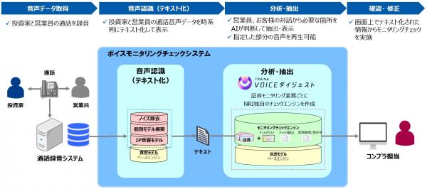 NRIは、音声認識技術と人工知能を応用した製品として、コールセンターで多数の導入実績がある「TRAINA VOICEダイジェスト(旧製品名:TRUE TELLER VOICEダイジェスト)」を、本システムのベースとして採用した上で、みずほ証券が行うモニタリング業務に適合するよう、要約エンジンについてはカスタマイズする形で開発しました。
