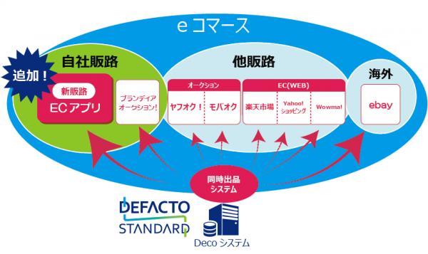 デファクトスタンダードの主な国内販路は、「自社販路」の『ブランディアオークション!』、『ヤフオク!』をはじめとする「オークションサイト」、『楽天市場』『ワウマ』などの「EC(WEB)サイト」がメインでしたが、この度の販路拡大は自社販路の中の「ECアプリ」という新たなカテゴリの位置付けになります。