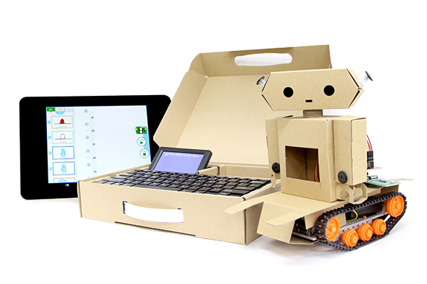 習字セットのように、モニターやキーボード、ケーブル類が専用の段ボールケースに収められていて、ケースから出さずにそのままプログラミングに取り掛かることができます。学校の机でも利用できるようコンパクトに設計されており、モバイルバッテリー(オプション)を利用すればコンセントを使用せずともプログラミングを行えます。