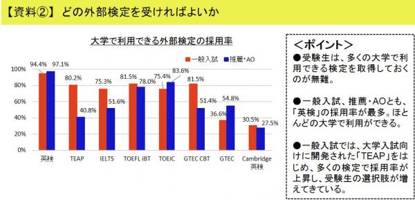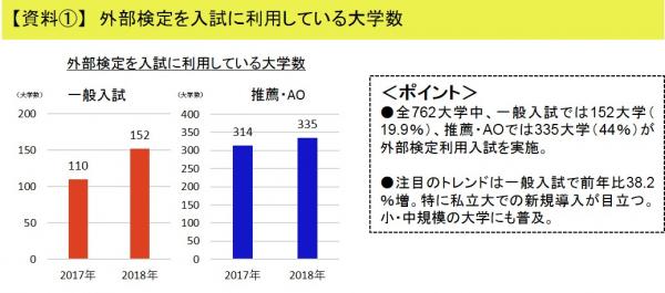 今年の注目は一般入試。2021年1月にスタートする、センター試験に代わる「共通テスト」では、外部検定の成績が利用可能になり、さらに国立の一般入試では必須化の方針が出されました。この改革に先んじて、各大学の一般入試では、すでに利用が急激に広がっています。