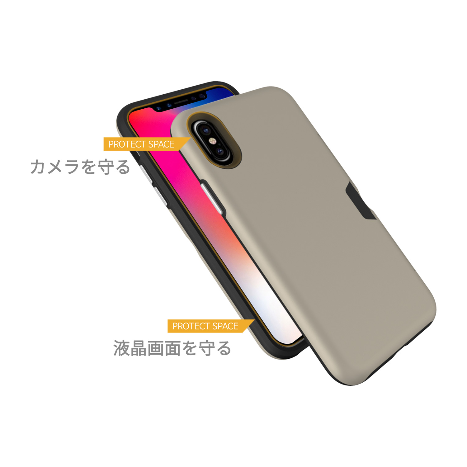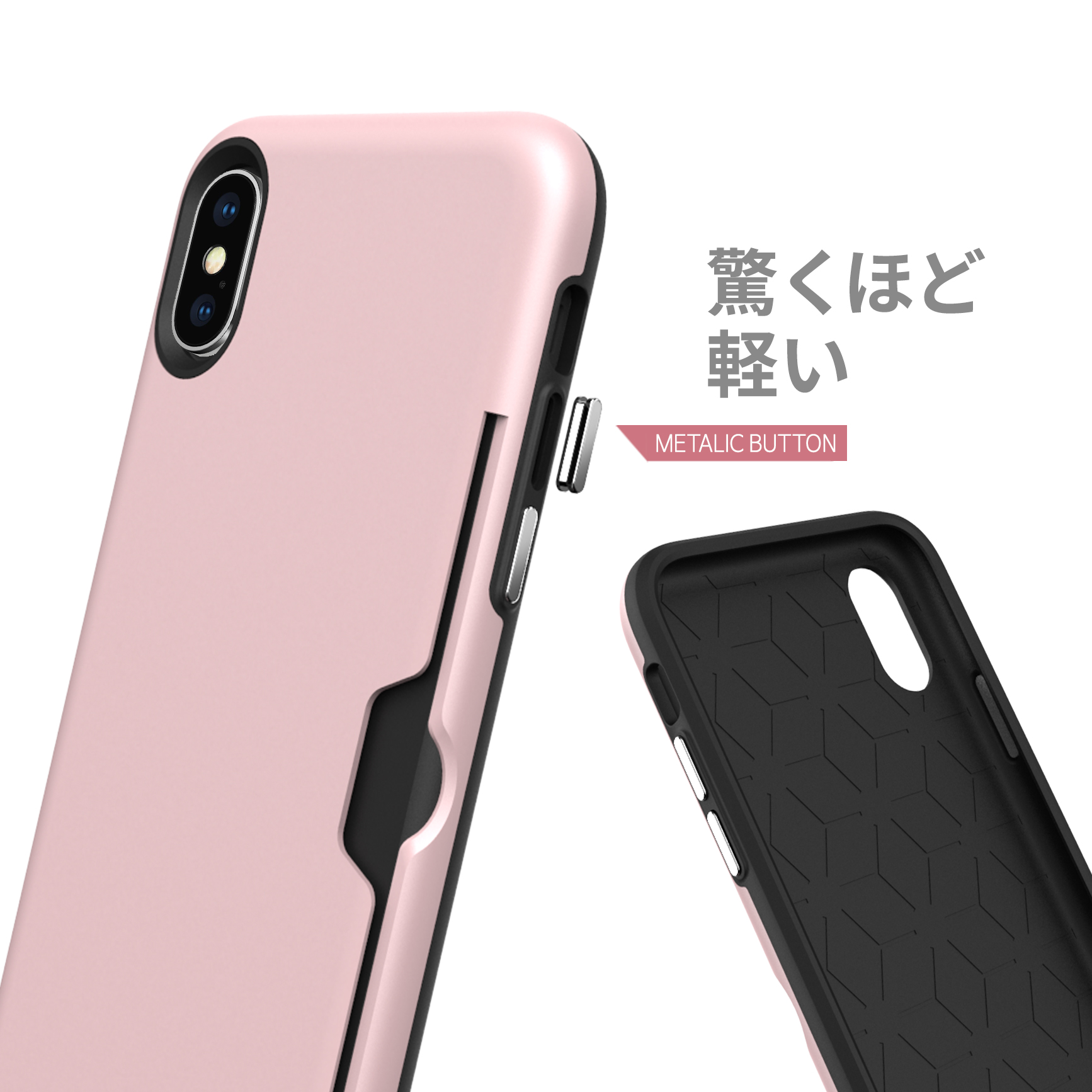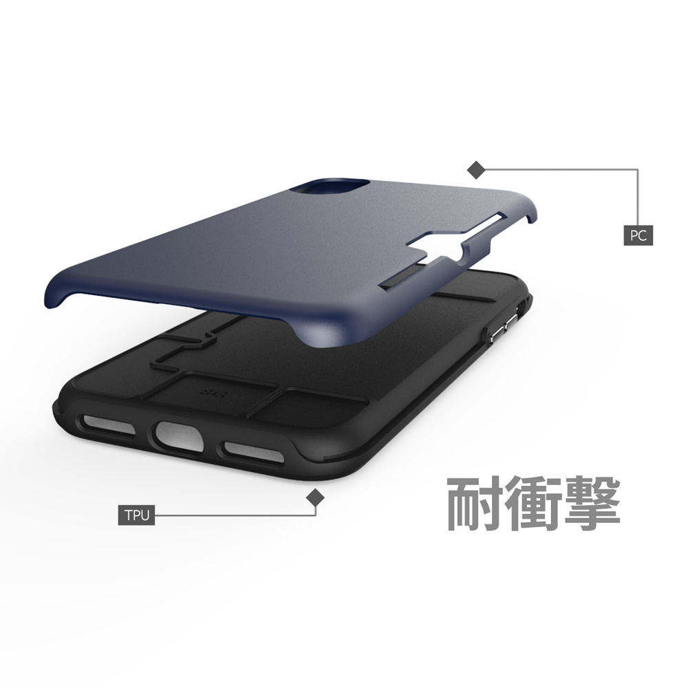 iPhoneを落下衝撃から守る耐衝撃ケースとしての役割を持たせるため、衝撃をしなりで分散させる硬質ポリカーボネート素材と、ショックを柔らかく受け止めるTPU素材の2層構造を採用。限られたスペースで、衝撃を緩和する工夫を凝らしました。