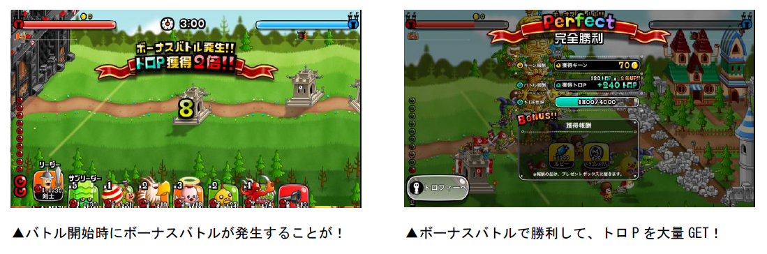 各キャラのトロフィーは、「トロP」を一定数貯めると獲得することができます。トロPは「キャラのLvが20以上」「うまP200以上」など、各キャラによって異なる条件を満たした状態でバトルを行なうと獲得できます。また、バトルを開始すると「ボーナスバトル」が発生することがあり、バトルの勝敗に関係なく、獲得トロPが2・3・5・10倍のうちいずれかの倍率で増加します。ボーナスバトルが発生したら、勝利してトロPの大量獲得を目指しましょう!