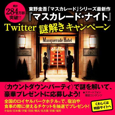 累計発行部数284万部突破! 第1作『マスカレード・ホテル』が木村拓哉さん主演で映画化されることで話題の、東野圭吾・著「マスカレード」シリーズ。その最新作である『マスカレード・ナイト』の世界観が楽しめる「Twitter謎解きキャンペーン」では、12月12日(火)から12月24日(日)まで参加ご応募受付中です。