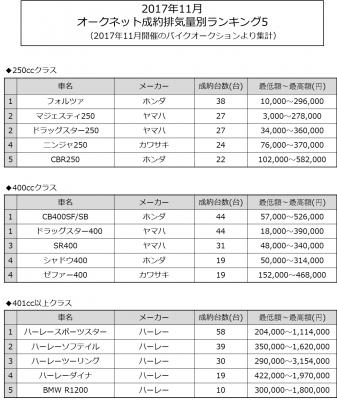 情報流通支援サービスの株式会社オークネット(本社:東京都港区/社長:藤崎清孝)は、2017年11月度のオークネットバイクオークションにおける成約台数を集計し、排気量別ランキングベスト5をまとめました。