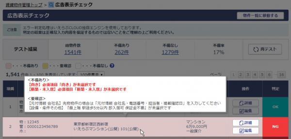 「広告表示チェック機能」とは、いえらぶCLOUD内に登録されている物件情報を確認し、入力の不備を自動的に検出する機能です。ポータルサイトやホームページに出稿する際に、不足している情報や禁止文字などの不備を一括で確認することが可能です。