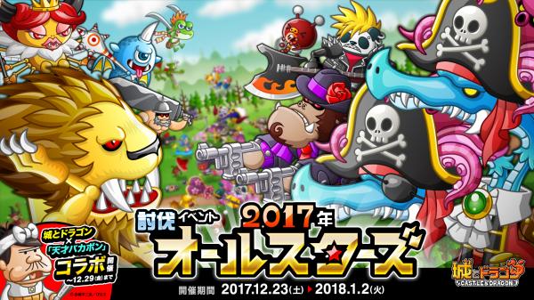 12月23日(土)より2017年に登場したキャラが敵として登場する討伐イベント「2017年オールスターズ」を開催いたします。また、「トロフィーバトル」での、獲得トロPが通常より増量する「ボーナスフィーバー」や、「シルバークラス以下限定リーグ」なども開催いたします。年末年始もイベント盛りだくさんの『城とドラゴン』をお楽しみください!