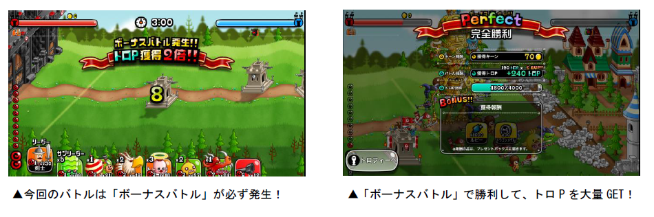 「トロフィーバトル」は、各キャラのトロフィー獲得を目指して、全国のプレイヤーとバトルを行ないます。今回は「ボーナスフィーバー」が同時開催され、全てのトロフィーバトルが、獲得トロPが2倍以上となる「ボーナスバトル」となります。ひとりではもちろん、目の前にいる友達やフレンドと一緒にトロフィー獲得を目指しましょう!