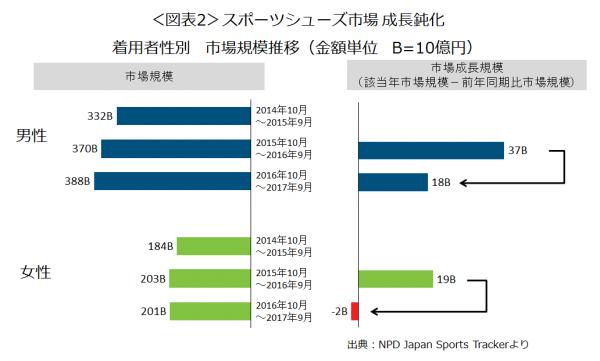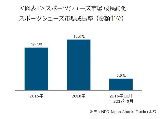 スポーツシューズ市場は、2015年の成長率は10.1%、2016年は12.0%と2年連続で2桁成長でした。しかし最新の直近1年(2016年10月~2017年9月計)で前年同期比を見ると2.8%増で、プラス成長ではあるものの成長率は急激に落ちています(図表1)。