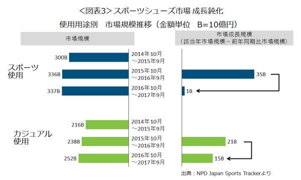 使用用途別※2にみると、最新の直近1年(2016年10月~2017年9月計)では、「スポーツ使用」の方が「(スポーツ使用以外の)カジュアル使用」よりも市場成長鈍化へ大きく影響しています(図表3)。