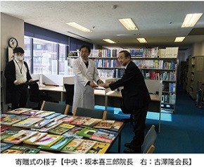 12月11日(月)、静岡トーハン会会長のマルサン書店・古澤隆社長と、トーハン静岡支店の永田アシスタントマネジャーが静岡県立こども病院(静岡市葵区)を訪問し、「入院している子どもたちのために本を活用してほしい」と坂本喜三郎院長に本を手渡しました。