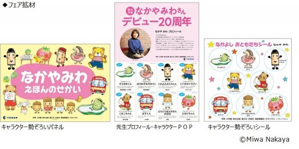 「なかやみわ えほんのせかい」は、愛くるしいキャラクターを一堂に集めたトーハンオリジナルフェアです。参加書店では、代表的な作品9点と、特別に作成したフェア拡材の「キャラクター勢ぞろいパネル」、「先生プロフィール・キャラクターPOP」を展開し、作品の魅力をアピールします。