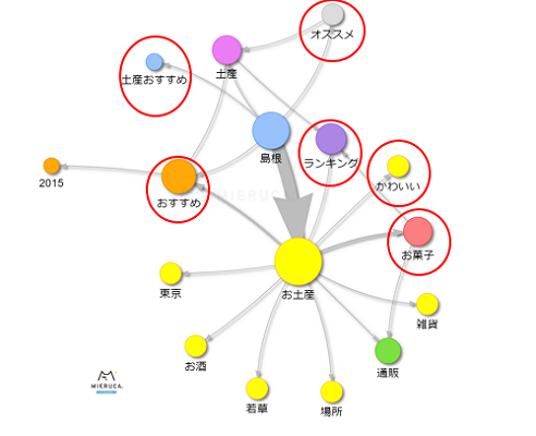 【上図】ミエルカの「サジェストキーワードネットワーク」機能で、「島根 お土産」を調べたユーザーの検索意図を自動で分類・可視化した例