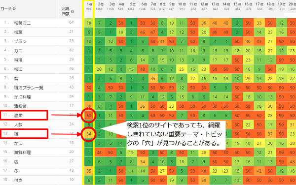 対象キーワードを語る上で重要なテーマ・トピックがどこまで網羅できているかを示す『コンテンツヒートマップ』。しっかり書けていれば緑色、書けていなければオレンジ色で表示される。「島根 カニ」の上位サイトを比較した左図では、検索1位のサイトでも「温泉」や「宿」といった、重要なテーマが抜け落ちている可能性が高いと読み取れる。
