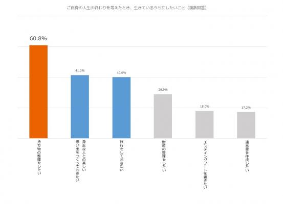 人生の終わりを意識した際にやりたいこととして「持ち物整理」が1位になりました。「終活」と大げさに考え、普段の生活から離れたことをやるのではなく、まずは身近なところから始めようとする傾向が伺えます。