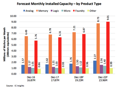 ICインサイツ社 (IC Insights) が出版した「世界のウエハー生産能力 2018-2022年 - Global Wafer Capacity 2018-2022」は、IC業界におけるウエハー製造工場での生産能力について詳細に分析を行い、今後5年間について、1年毎の生産能力予測を提供しています。
