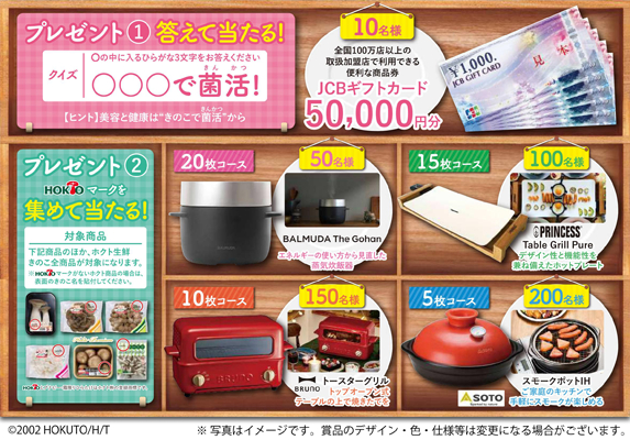 クイズに答えてご応募いただくと、抽選で「JCBギフトカード 5万円分」を10名様にプレゼント。また、ホクトのきのこのパッケージに付いているHOKTOマークを必要枚数分集めてご応募いただくと「BALMUDA The Gohan」や「PRINCESS Table Grill Pure」、「BRUNO トースターグリル」、「SOTO スモークポットIH」の4種類が合計500名様に当たります。
