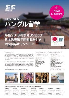 2017年11月に開校したばかりのEFソウル校はソウル有数の繁華街・江南地区の中心地に位置し、経験豊富な教師陣と最新のオンライン学習ツールを活用したインタラクティブな学習カリキュラムを提供しています。ハングル限定留学キャンペーンでは、平昌2018冬季オリンピック開催期間中に対象コース(2018年2月19日~3月2日まで開講される週26レッスンのジェネラルコース)を受講した方に、平昌2018冬季オリンピックの日本代表選手団観戦券をプレゼントします。