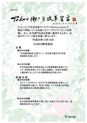 システムエンジニアリング、アプリ・システム開発のCLINKS株式会社(本社:東京都中央区 代表:河原浩介 以下CLINKS)は、2017年12月19日に、東京都が都内で事業を営む企業等の働き方、休み方の改善に向けた気運を高めていくために進めている「働き方改革推進事業」における「TOKYO働き方改革宣言企業」に承認されました。