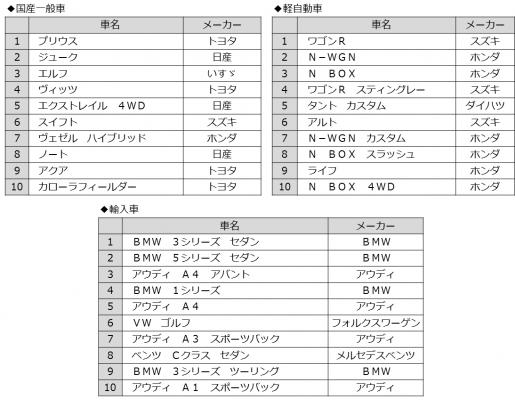 国産車では、プリウスをはじめ低燃費車が数多くランクインしました。軽自動車では、輸出の影響により1位にワゴンR が返り咲き、ホンダが数多くランクインしました。輸入車はBMWのランクインが目立ちました。
