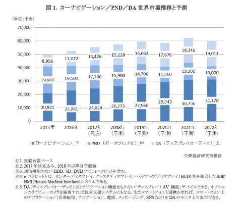 本調査におけるカーナビは主に乗用車向けであり、自動車メーカー(OEM)が工場で装着するメーカーオプション(MOP)、ディーラーで装着されるディーラーオプション(DOP)、カー用品店等で購入される市販品をさす。また、自動車のインスツルメントパネルやセンターディスプレイに一体して組み込まれるeコクピットを含む。