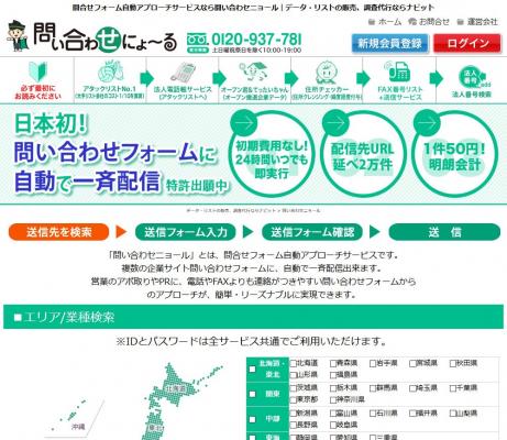 「問い合わせにょーる」では、「エリア」や「業種」を選ぶだけで、ターゲットの業種の「問い合わせフォーム」に一括で一斉配信することができて、とても便利です。しかもオープンサイトなので、どなたでもご利用できます。送信費用は一件50円~65円です。