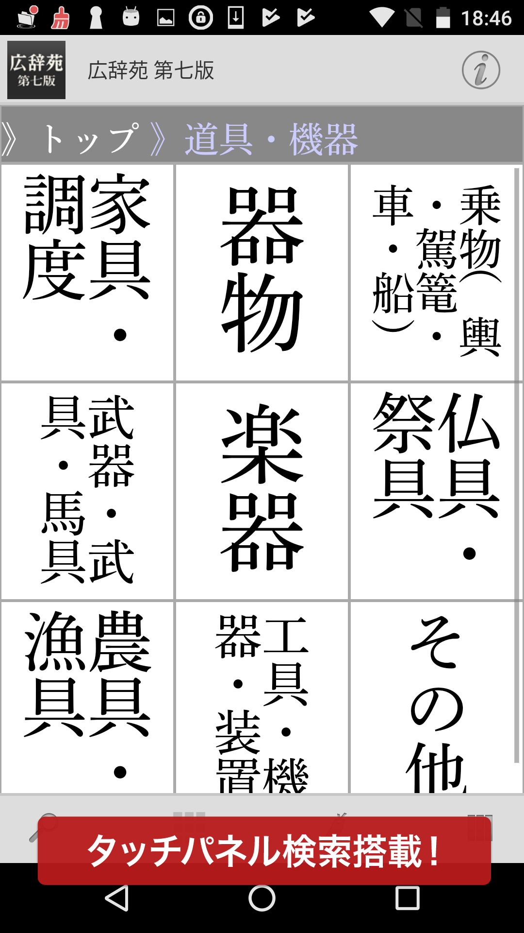 画面を最大限活用したタッチパネル検索を搭載。単語を記したパネルを所狭しと並べることで周囲の単語を見渡すこともでき、従来不足しがちとされてきた一覧性を補いました。